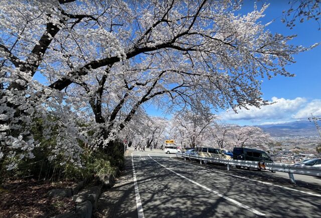 駐車場から並木道を進むと、山の斜面を活かした立体的な桜のトンネルが続き、その先に広がる景色は圧巻。